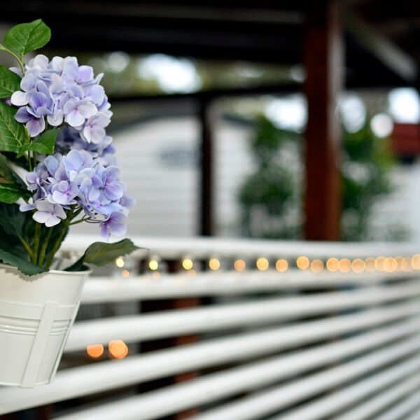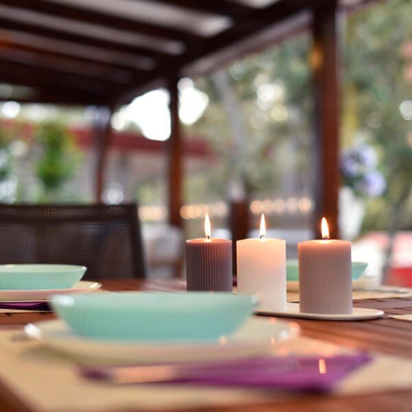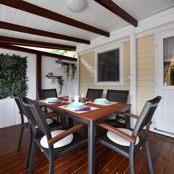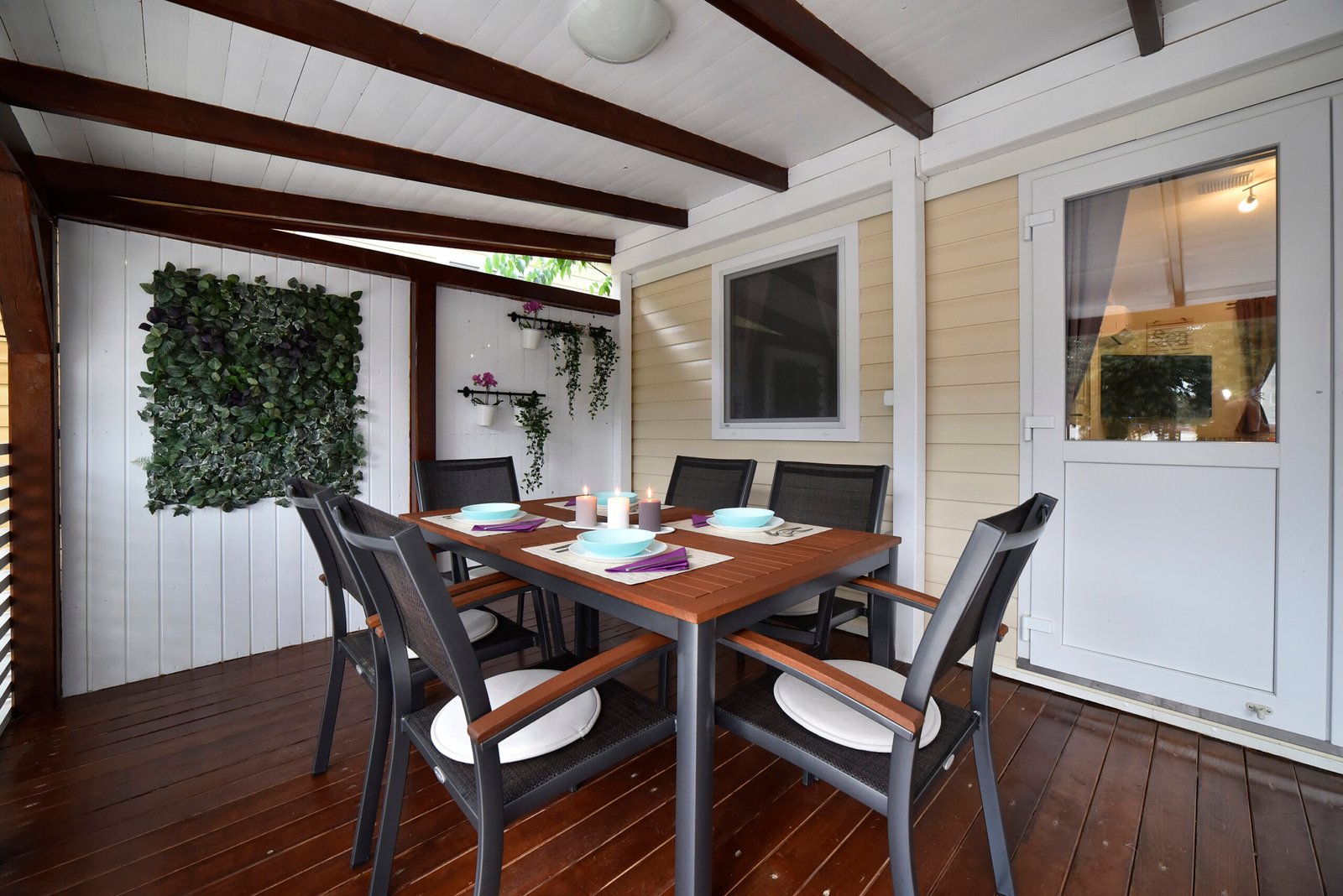Natkrivena terasa je produžetak dnevnog boravka i mjesto gdje se najlakše prebacite u “ljetni mod”. U hladu borova uživate u jutarnjoj kavi, ručku na svježem zraku ili opuštanju predvečer, uz dovoljno prostora za druženje. Roštilj je idealan za jednostavne večere na otvorenom, a zelenilo oko kućice daje privatnost i onaj miran osjećaj boravka u prirodi, iako ste svega par minuta od mora.